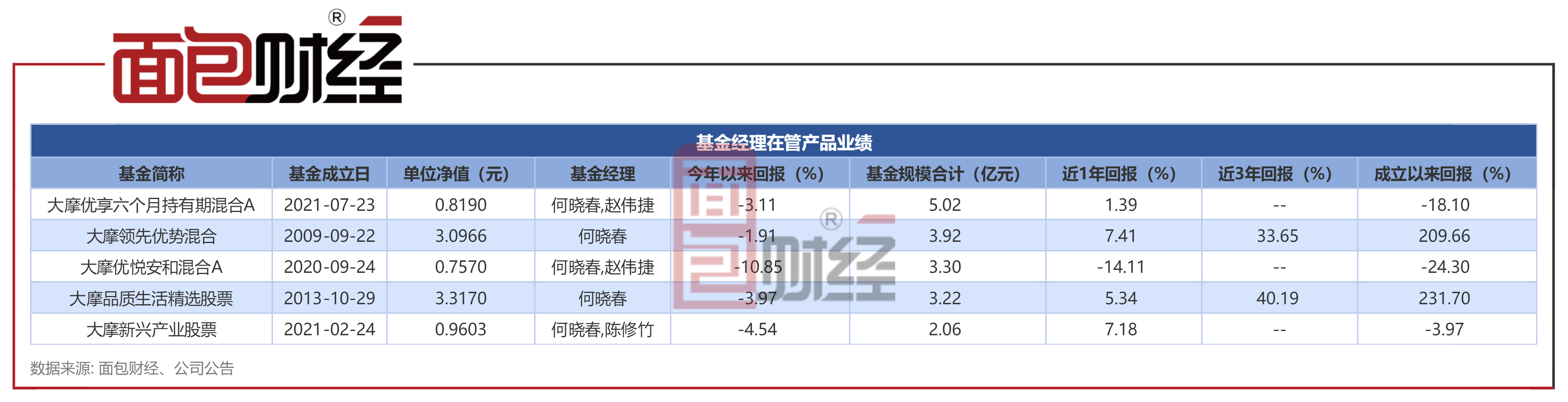 目前,何晓春主要管理大摩优享六个月持有期混合、大摩领先优势混合、大摩优悦安和混合等5只产品(初始基金口径,包括共同管理产品,下同),上述产品合计规模约为17.51亿元。