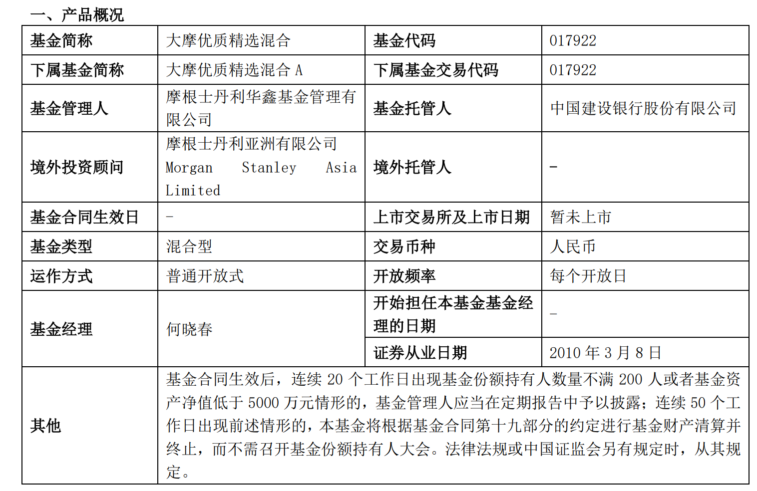 2023年4月27日,摩根士丹利华鑫基金发布公告称,摩根士丹利华鑫优质精选混合型证券投资基金(以下简称“大摩优质精选混合 ”)自5月15日至6月2日通过基金管理人指定的销售机构公开发售,募集期限不超过3个月。