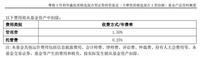 大摩优质精选混合包括A/C类基金份额,A 类基金份额收取认购费用,C 类基金份额不收取认购费用。以A类基金份额为例,该基金的认购费率为1.2%(认购金额小于100万),申购费率为1.5%,年管理费率为1.5%、年托管费率为0.25%。