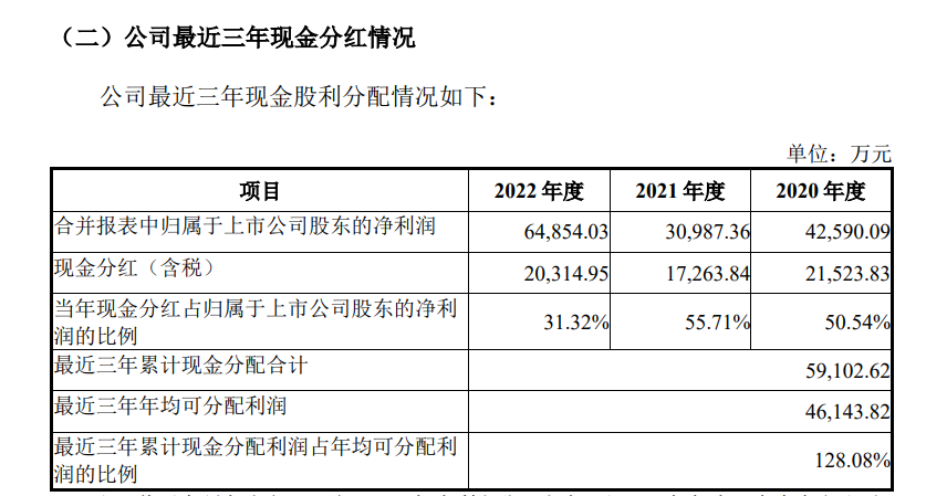 近两年业绩快速增长下,公司于2023年5月15日发布2022年分红预案实施公告。公告显示,2023年5月19日,公司以5月11日收盘后总股本约8.83亿股为基数,向全体股东每10股派发现金股利2.3元,共计分配股利约2.03亿元(含税)。至此,公司最近三年累计分红占年均可分配利润的比例达128.08%。
