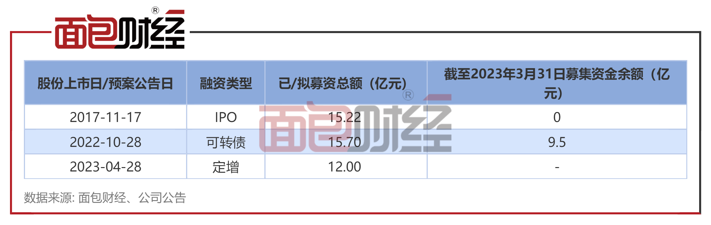 数据显示,去年10月公司完成可转债发行,募资15.7亿元。截至2023年3月末,此前可转债募集资金有约9.5亿元未投入使用。