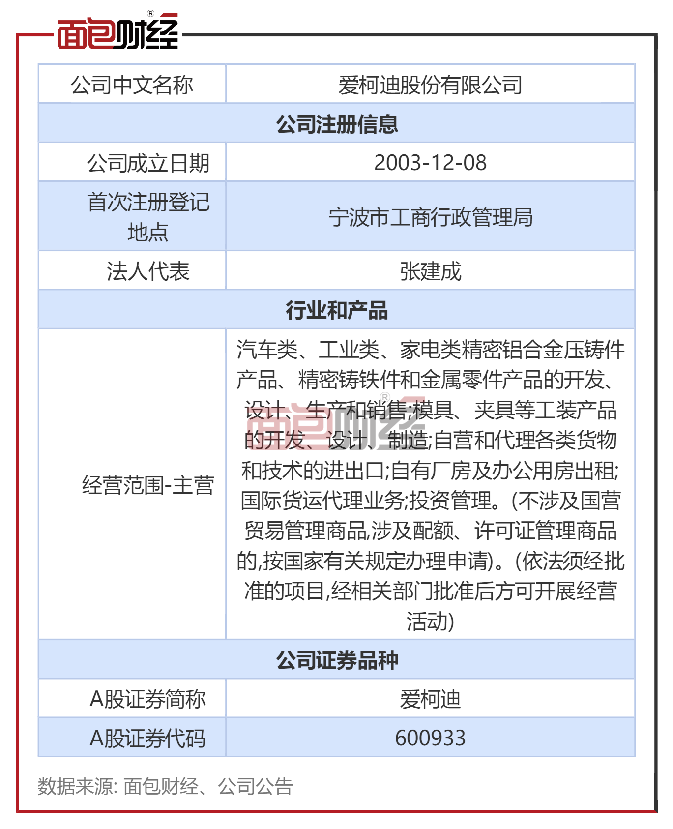 爱柯迪于2017年上市,主营业务为汽车铝合金精密压铸件的研发、生产和销售。