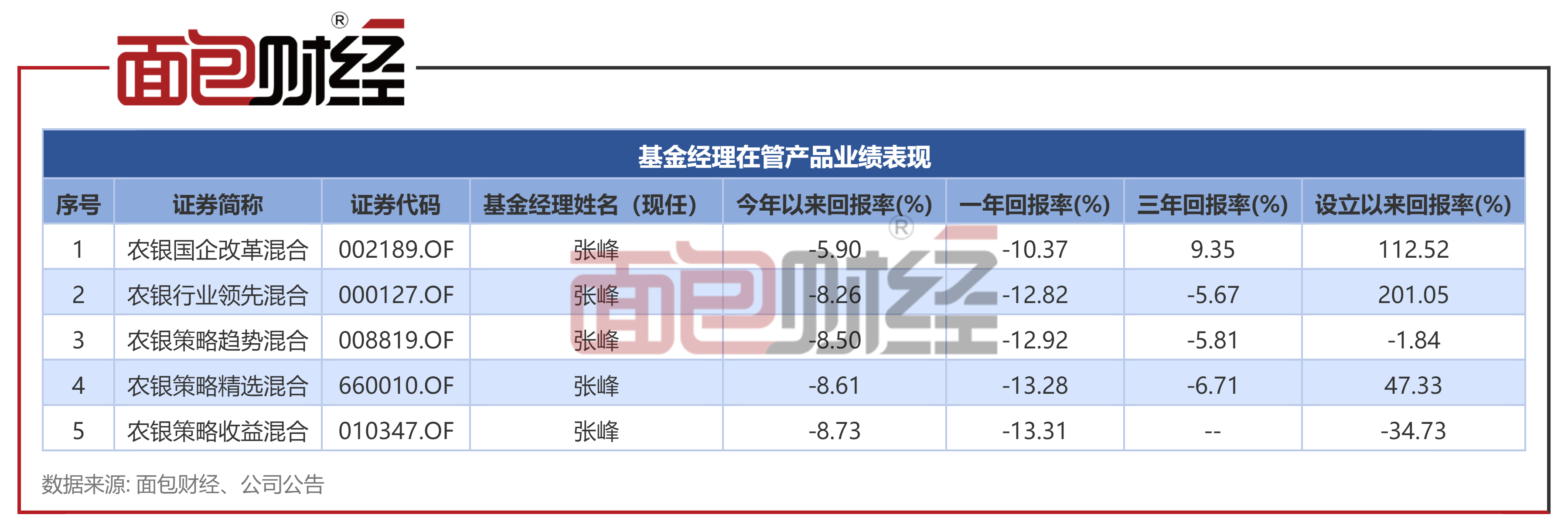 目前,张峰主要管理农银策略收益混合、农银策略精选混合等5只产品,合计管理规模超过90亿元。2023年以来,张峰在管产品年内净值均回撤5%以上。