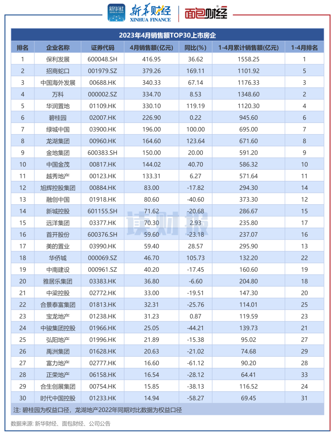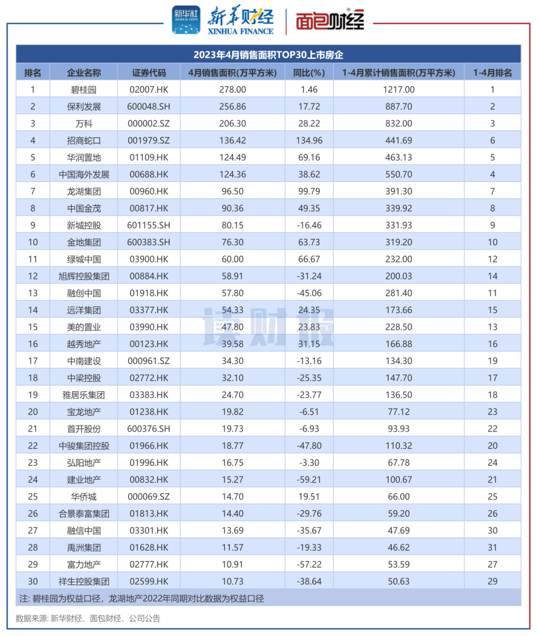 主流上市房企2023年4月销售数据已经披露完成。新华财经和面包财经研究员在剔除部分数据披露不全的上市房企后,以沪、深、港三大交易所主要上市房企为样本,分别统计销售金额、销售面积以及销售均价排名前三十的企业。