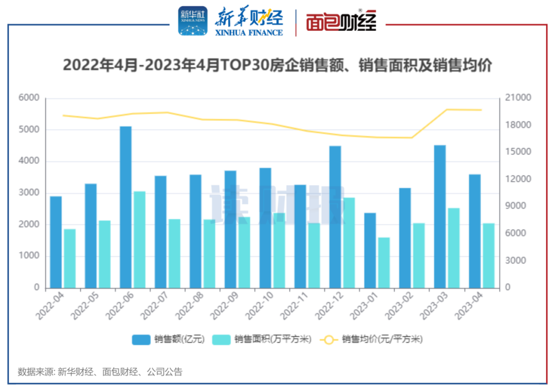 图1:2022年4月-2023年4月TOP30上市房企销售额、销售面积及销售均价