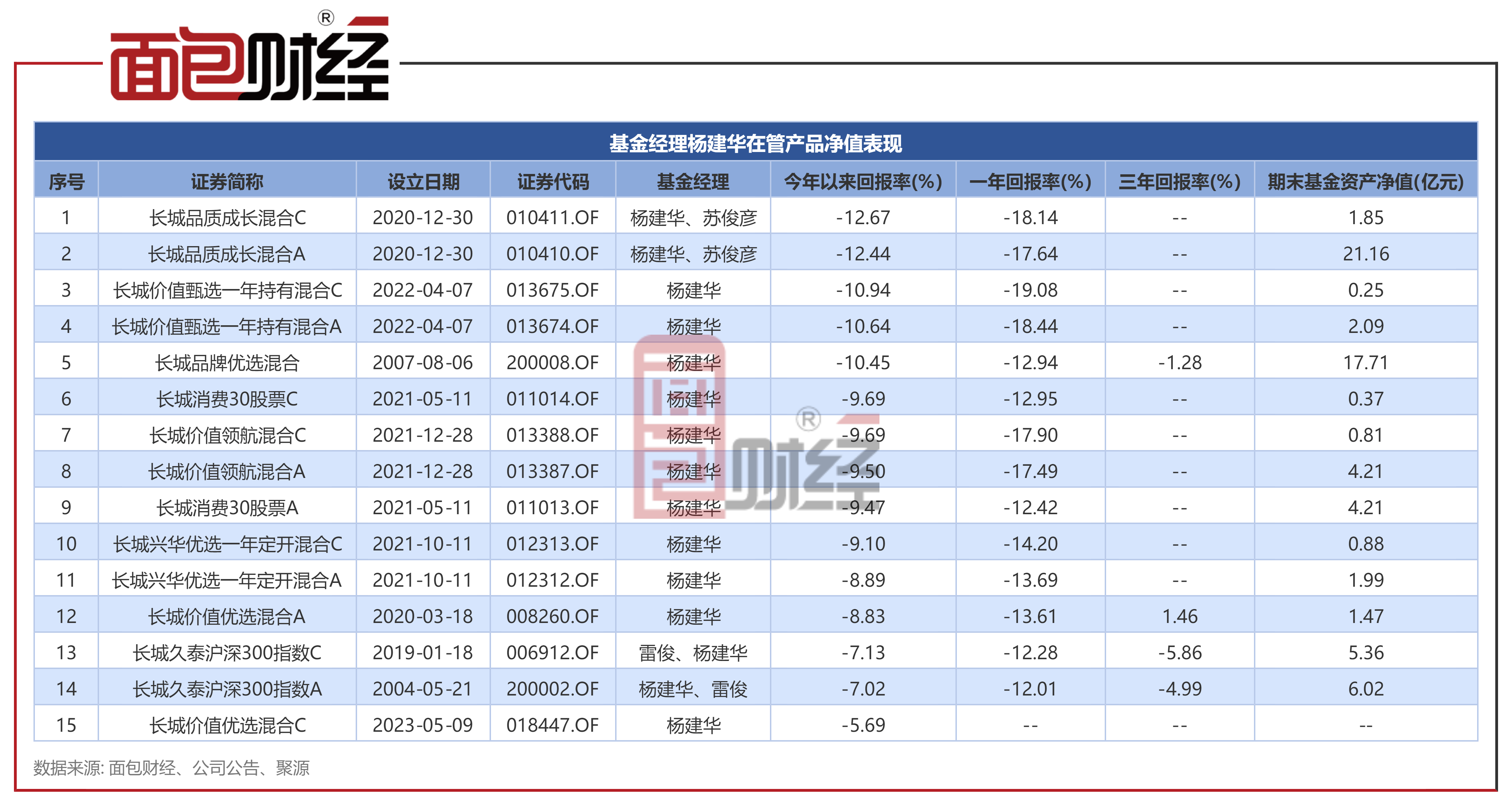 杨建华目前主要管理包括长城品质成长混合、长城品牌优选混合、长城久泰沪深300指数等在内的8只基金(初始基金口径,下同)。