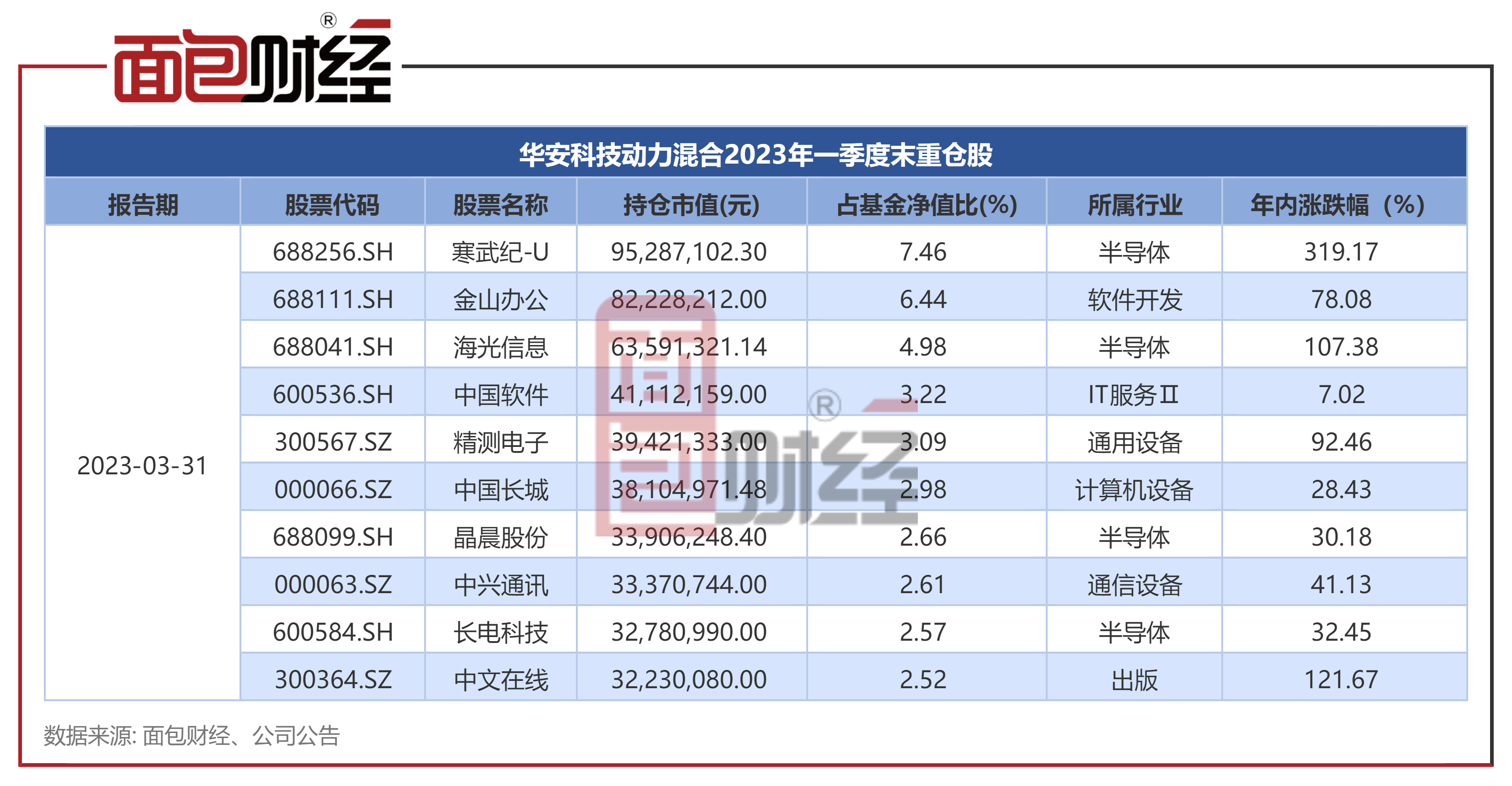 研究发现,华安科技动力混合重仓持有AI产业链相关股票,2023年一季度末的前三大重仓股分别是寒武纪-U、金山办公、海光信息,年内股价分别上涨319.17%、78.08%、107.38%。