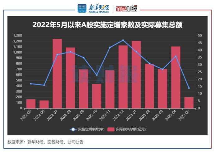 统计显示,2023年5月,A股上市公司共计14家实施定增,实际募资总额约200.65亿元,定增实施家数及实际募集资金环比均明显下降,但实际募集资金同比有所上升。