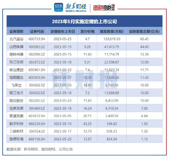 2023年5月实施定增的上市公司中,北汽蓝谷和山西焦煤实际募集总额均超40亿元。