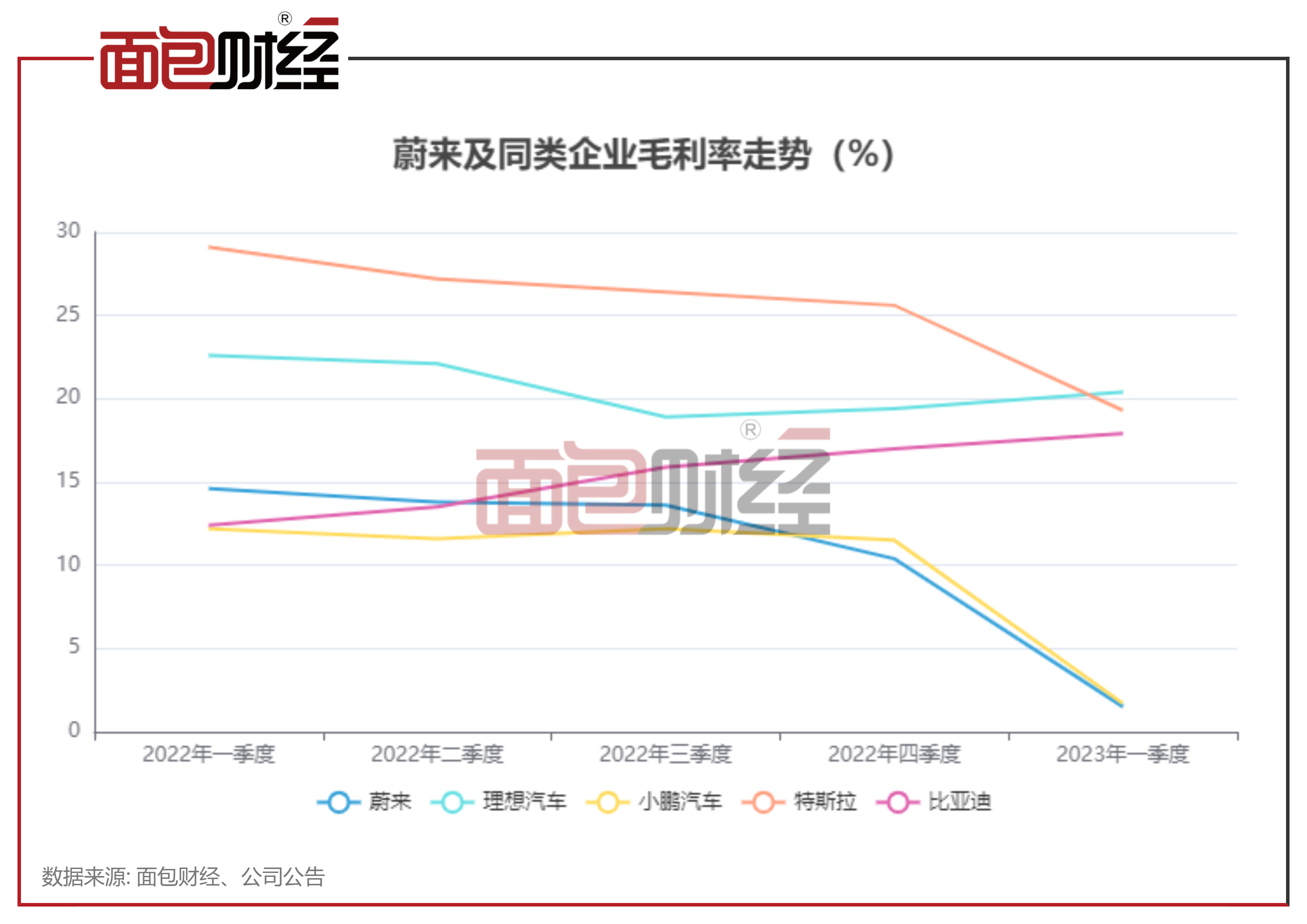 相较特斯拉,蔚来降价可能面临毛利率较低的掣肘。数据显示,蔚来、小鹏汽车的2023年一季度毛利率已降至2%以下,让利空间有限。相比之下,理想汽车、特斯拉、比亚迪的毛利率在15%以上,且比亚迪近几个季度毛利率在持续上升。