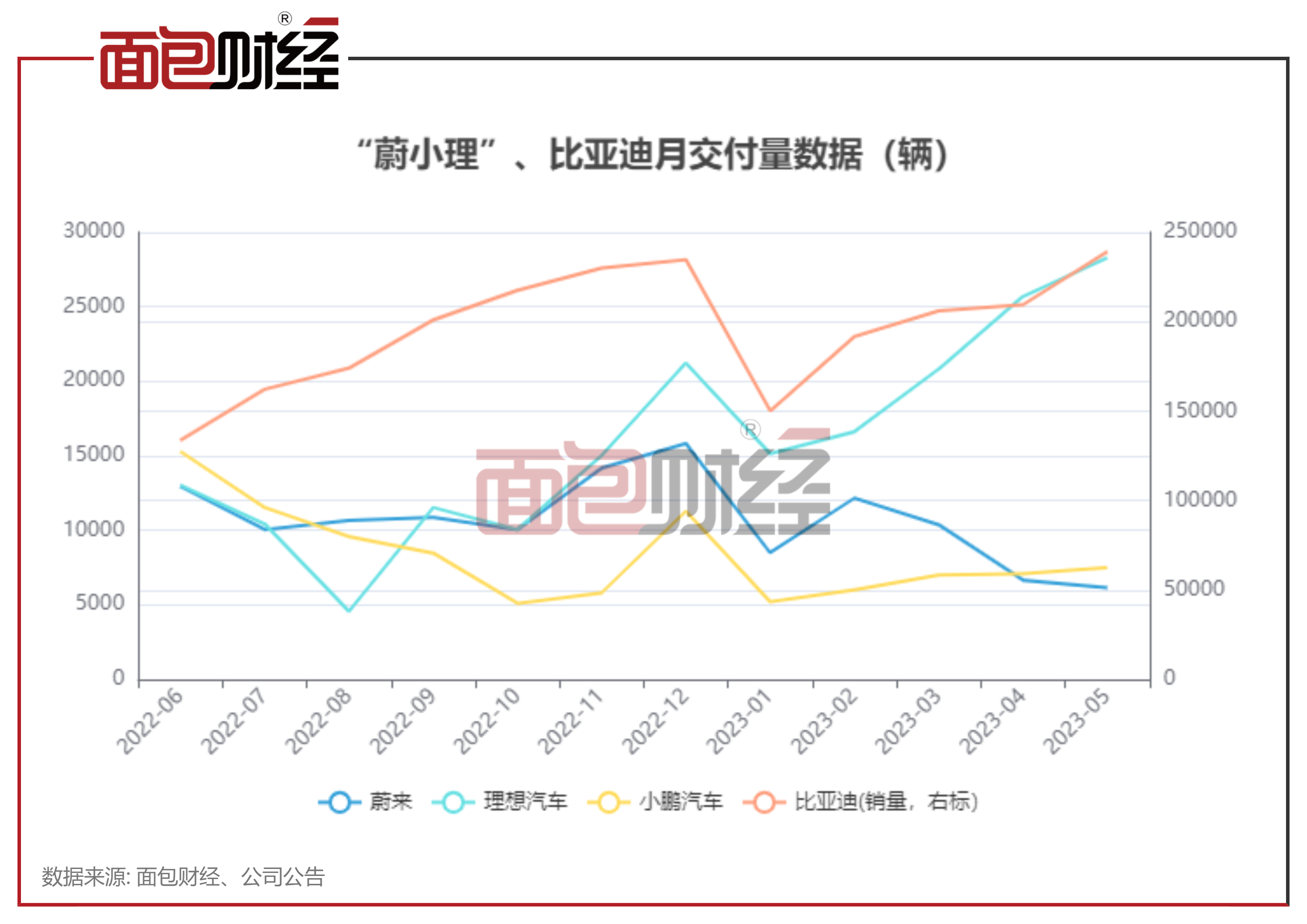2023年以来,理想汽车、小鹏汽车的交付量逐月上升,比亚迪销量大幅提高。此外,特斯拉在年初进行降价后,在今年一季度打破单季度交付记录,业绩显著上升。