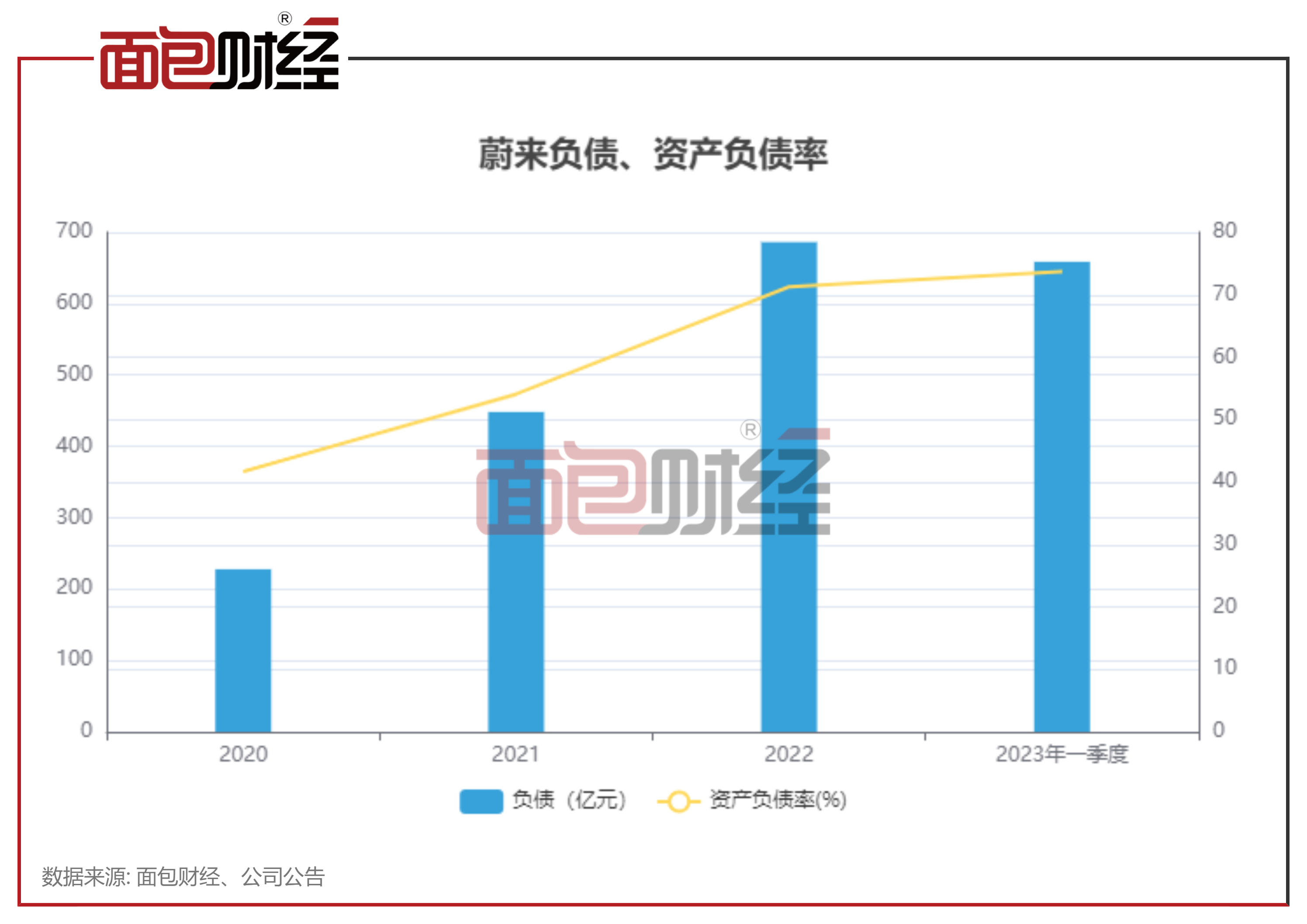 近几年,蔚来的负债总额和资产负债率呈上升趋势。2023年一季度末,蔚来的总负债为658.65亿元,资产负债率为73.7%,较2020年末上升超30个百分点。