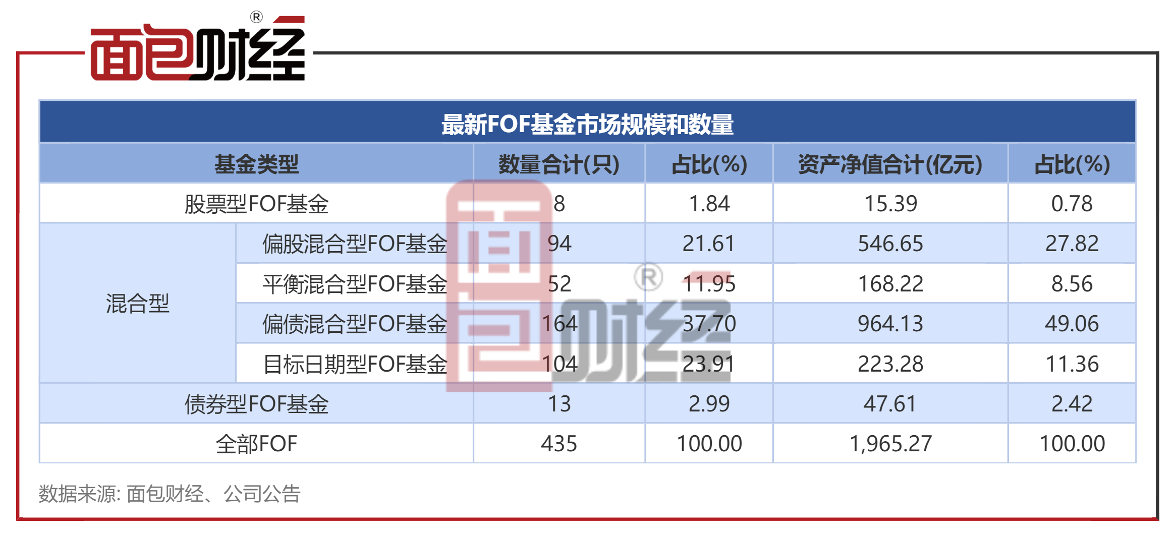 截至2023年6月15日,FOF基金一共有 435只,最新报告期规模达到1965.27亿元。其中,股票型FOF基金有8只(初始基金口径),总规模约15.39亿元,占全部FOF基金的比例相对较小。
