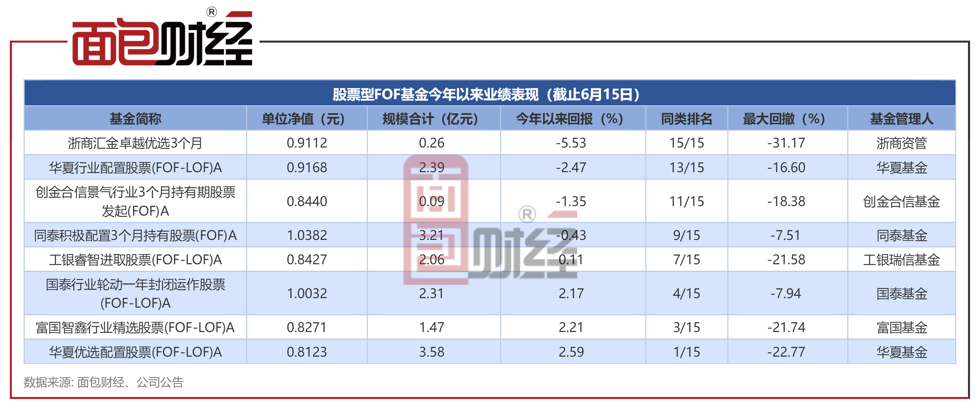 数据显示,全市场股票型FOF基金一共有8只,资产净值合计15.39亿元。截至6月15日(下同),多数产品单位净值不足1元,年初以来半数产品发生下跌,平均收益率为-0.98%。