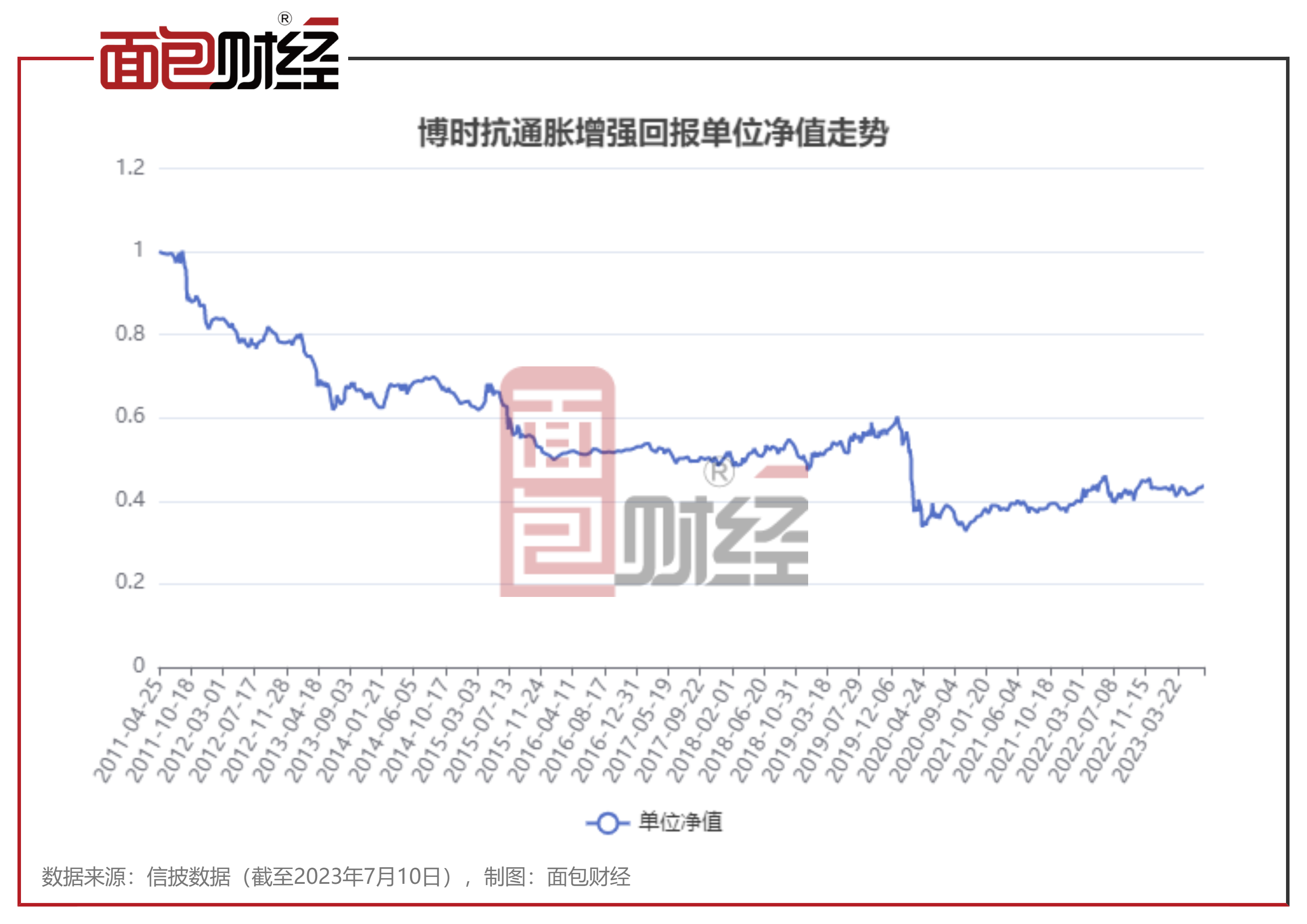 截至2023年7月10日,基金成立以来净值下跌56.2%。从历年基金表现来看,成立12年间,博时抗通胀增强回报有7年出现净利润亏损。其中,2020年基金净值回撤达到37.8%。