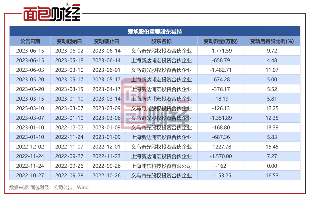 2023年6月15日减持公告显示,义乌奇光股权投资合伙企业于6月2日至6月14日减持股份1771.59万股;上海新达浦宏投资合伙企业于2022年12月19日至6月14日间累计减持2414.79万股。