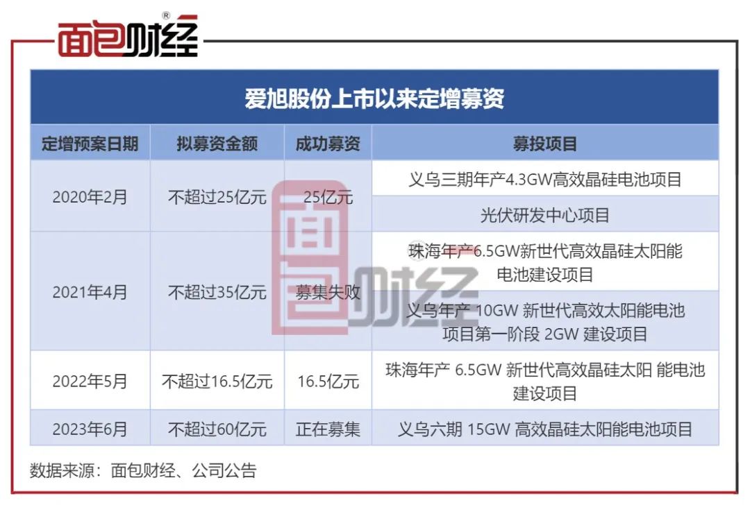 包括此次定增计划,爱旭股份2019年借壳上市以来已4次筹划定增,其中2次已完成。