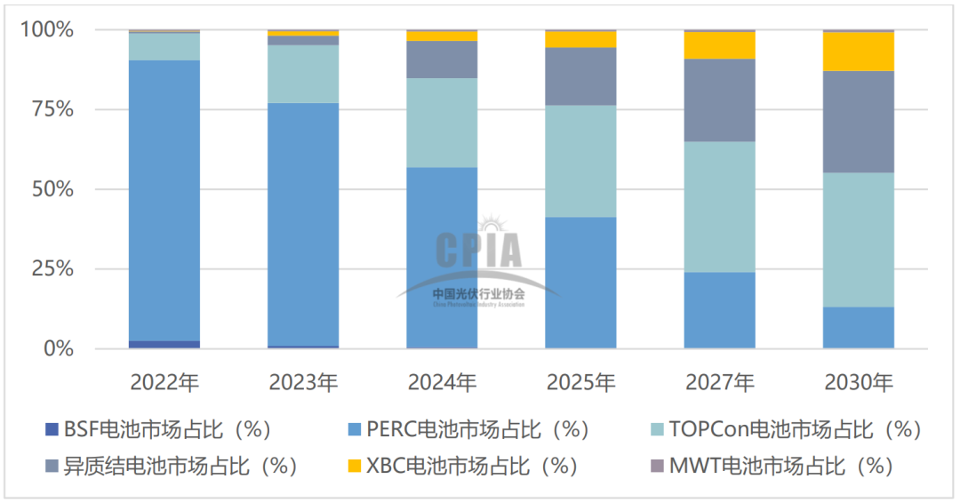 中国光伏行业协会发布《中国光伏产业发展路线图(2022-2023年)》中显示,2022年下半年部分N型电池片产能陆续释放, PERC电池片市场占比下降至88%,N型电池占比合计达到约9.1%,其中N型TOPCon电池片市场占比约8.3%,HJT市占率约为0.6%,XBC电池片市场占比仅0.2%。