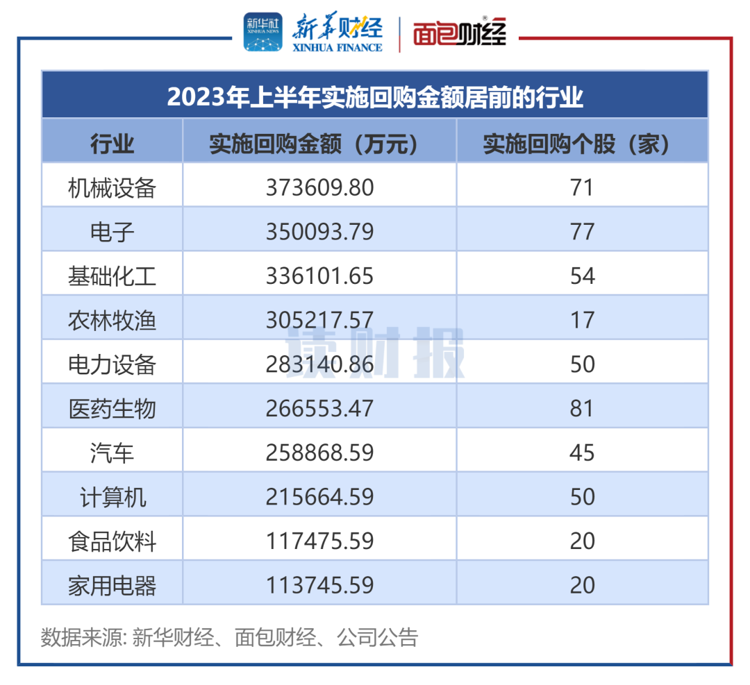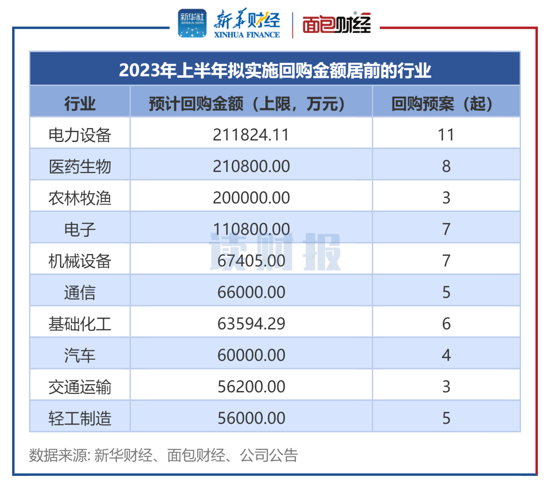 从行业分布看,2023年上半年,电力设备行业发布或通过11起回购预案,拟回购金额达21.18亿元,排在各行业之首;医药生物行业紧随其后,拟回购金额约为21.08亿元;农林牧渔行业发布或通过3起回购预案,拟回购金额约为20亿元,位列第三。