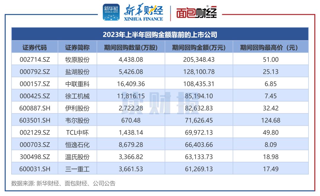 具体来看,牧原股份、盐湖股份及中联重科上半年回购金额位居前三,均超10亿元。