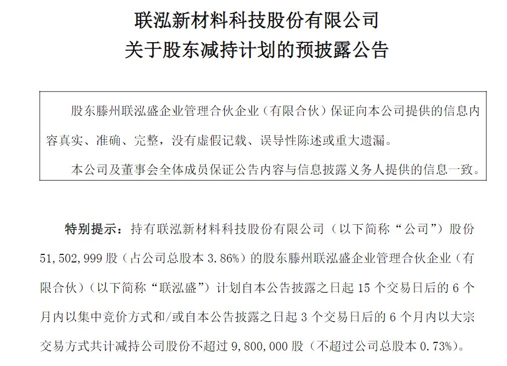 公告显示,联泓盛当前持有约5150.3万股股票(占公司总股本3.86%),计划6个月内以集中竞价方式或大宗交易方式共计减持公司股份不超过980万股(不超过公司总股本0.73%)。减持原因显示为个人资金需求。