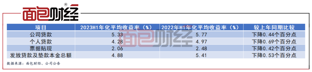 数据显示,2023年上半年,该行贷款总额年化平均收益率为4.88%,较去年同期下降0.53个百分点。其中,公司贷款年化平均收益率较年同期下降0.44个百分点;个人贷款年化平均收益率较上年同期下降0.69个百分点。