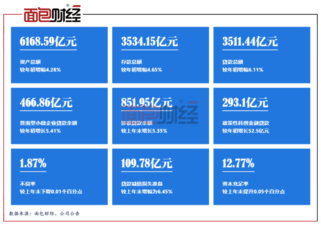 中报显示,截至2023年6月末,该行的资产为6168.59亿元,较年初增长253.46亿元,增幅4.28%;存款总额为3534.15亿元,较年初增长157.07亿元,增幅4.65%;贷款总额3511.44亿元,较年初增长202.23亿元,增幅6.11%。