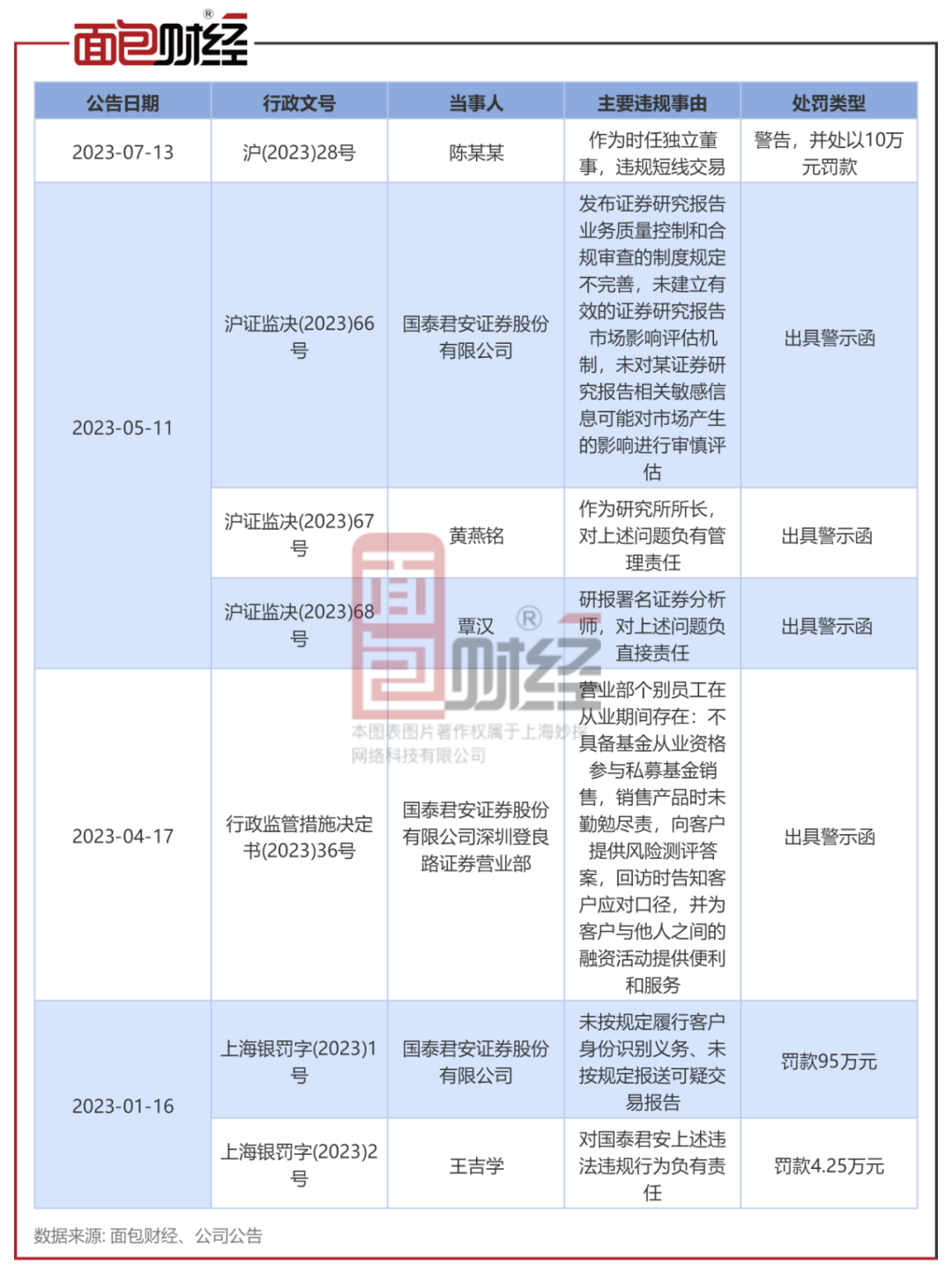 面包财经研究员梳理发现,截至2023年9月8日,今年以来,国泰君安及其个人已被证监会分局、中国人民分支行开出7张罚单,涉及处罚金额109.25万元;主要违规事由包括前独立董事违规短线交易、发布研报业务质量控制和合规审查的制度不完善、员工不具备上岗资质、违反《反洗钱法》等。