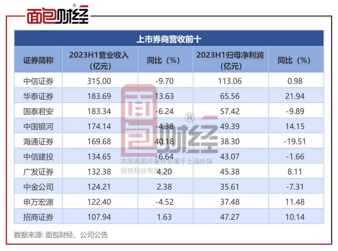 2023年上半年,券商业绩普遍较去年同期有所回升,营收排名前10的头部券商中,仅有2家券商营收及归母净利润较上年同期有所下降。