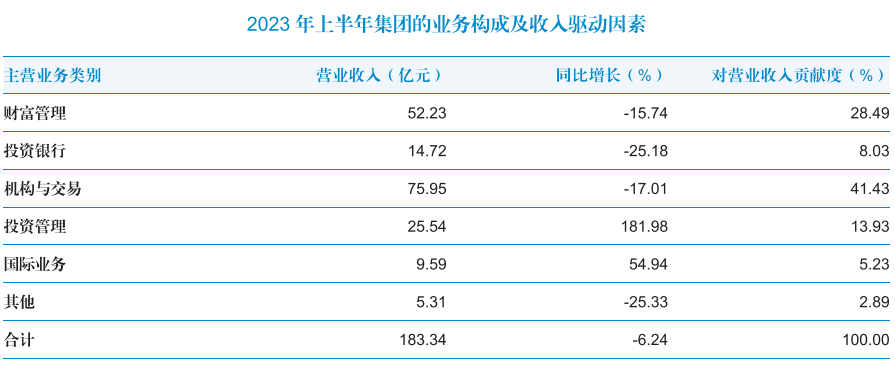 从主营业务来看,报告期内,该公司投资管理业务、国际业务收入同比增加;但该公司机构与交易业务、财富管理业务、投行业务收入均有下降。2023年上半年,该公司投行业务收入14.72亿元,同比下降25.18%,下降幅度较大。