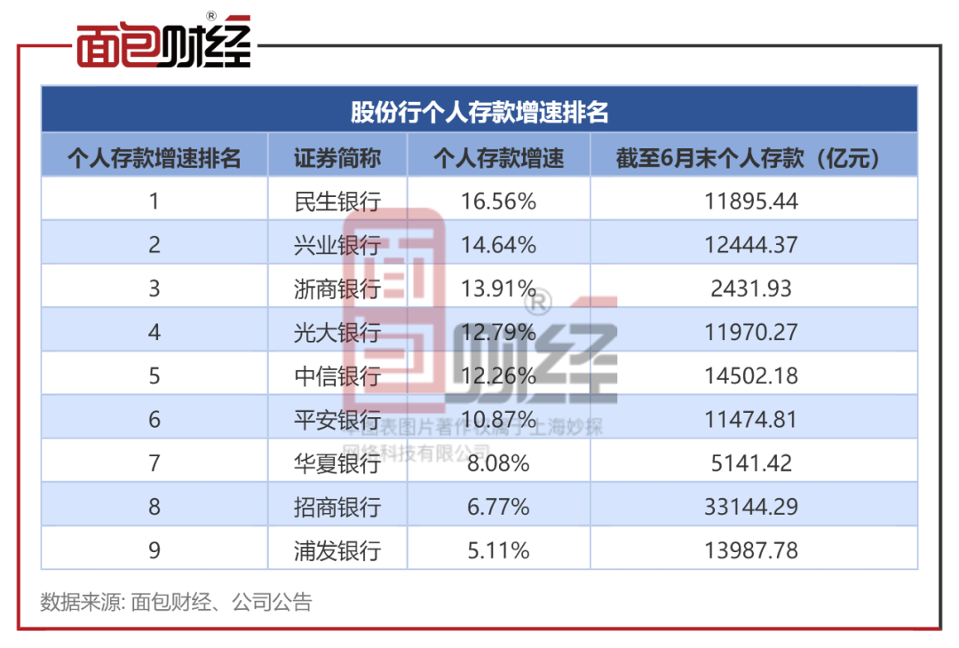 在零售贷款规模下降的同时,浦发银行在个人存款方面也面临着增速较低的风险。截至2023年6月末,该行的个人存款为13987.78亿元,增长为5.11%,增速在9家股份制商业银行中倒数第一。