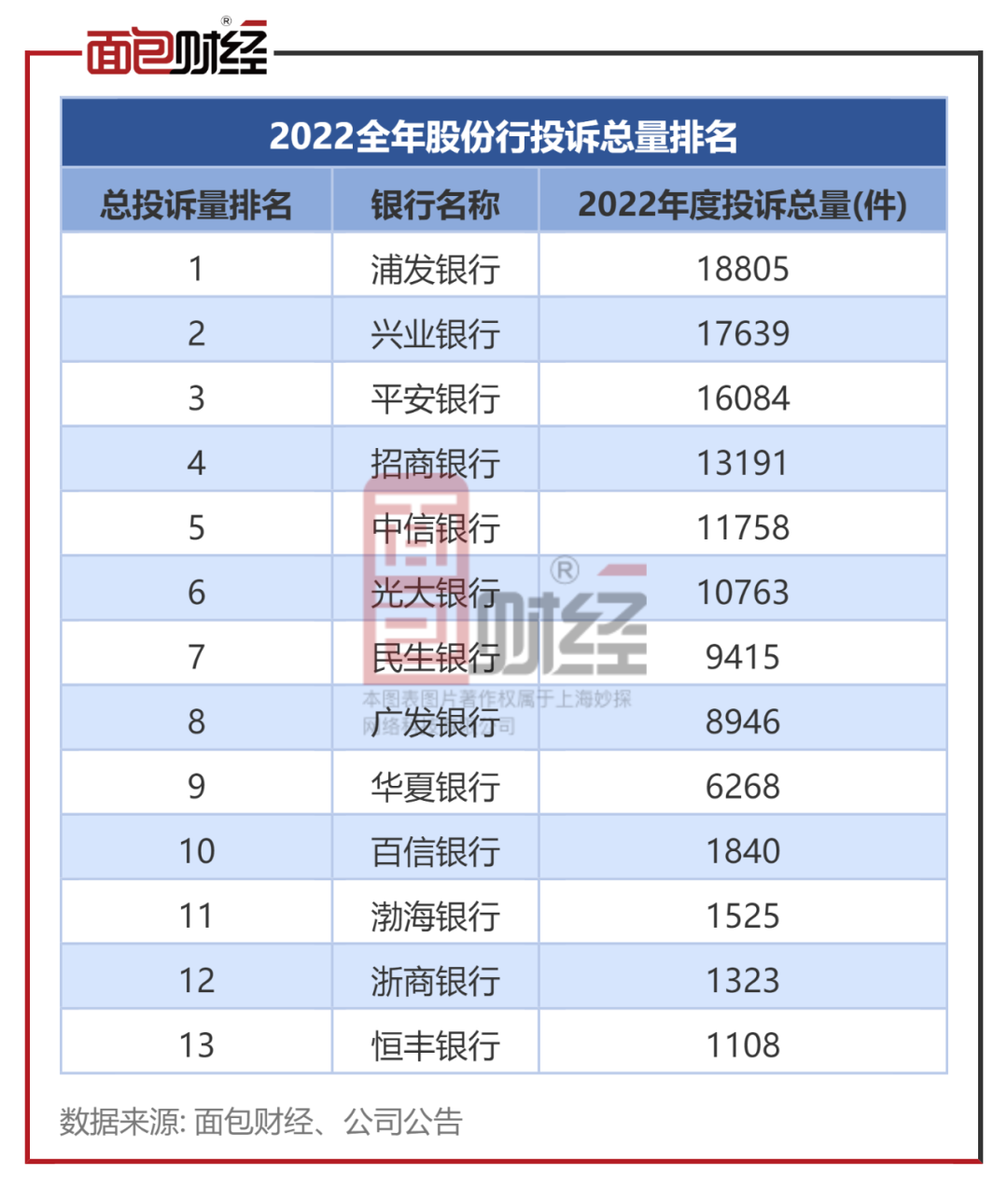 根据国家金融监督管理总局公布的银行业消费投诉数据,2022年,浦发银行总投诉量为18805件,同比增加13.88%,投诉量位居股份行首位。