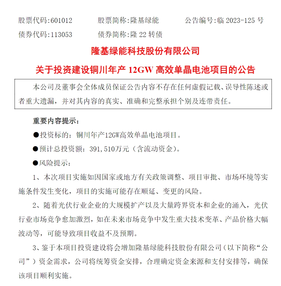 2023年1月17日,公司与陕西省西咸新区开发建设管理委员会、陕西省西咸新区泾河新城管理委员会在西安签订《投资合作协议》,就公司在陕西省西咸新区投资建设年产100GW单晶硅片项目及年产50GW单晶电池项目达成合作意向,预计均为2024年三季度首线投产,2025年底达产,预计项目总体投资金额为452亿元。