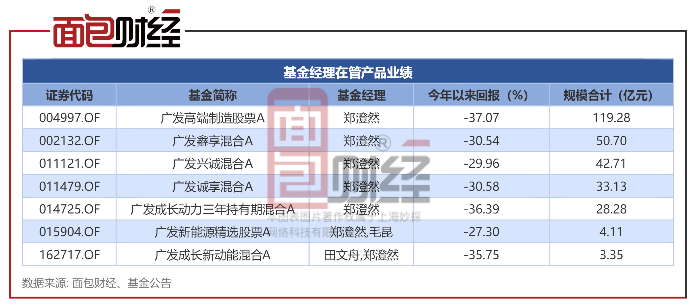 目前,郑澄然主要管理广发高端制造股票、广发鑫享混合、广发兴诚混合等7只产品(初始基金口径),上述产品合计规模约281亿元。