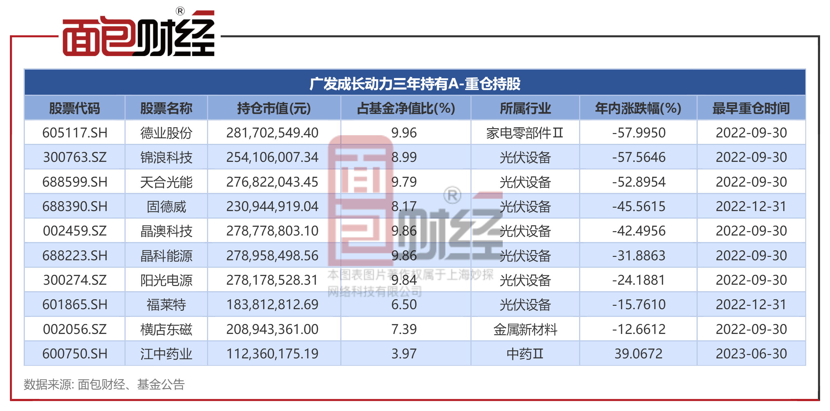 或因高位接盘,广发成长动力三年持有期混合重仓的德业股份、锦浪科技、天合光能年内股价跌幅超过50%。此外,该基金2022年下半年重仓的固德威、晶澳科技,今年以来持续下跌,年内股价跌幅超过40%。