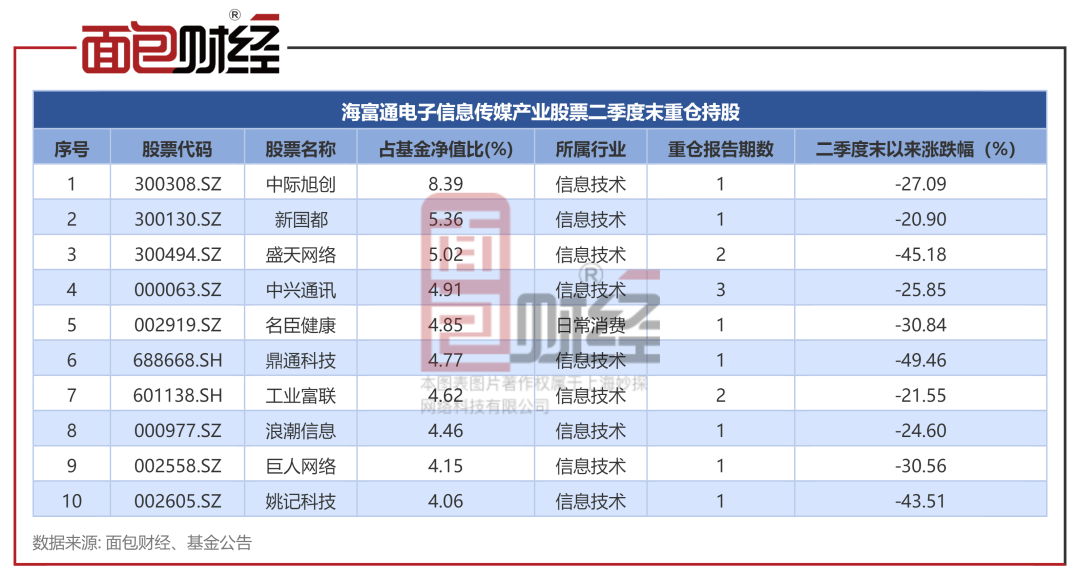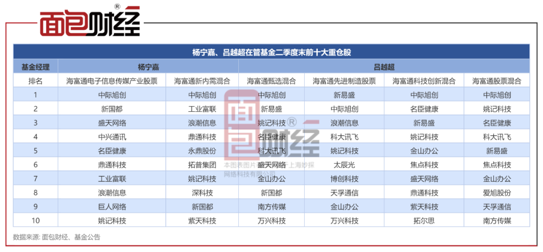 值得关注的是,其持仓与海富通基金另一基金经理吕越超旗下基金重仓股较为相似。截至二季度末,两者在管产品重仓股均包括中际旭创、姚记科技等个股。