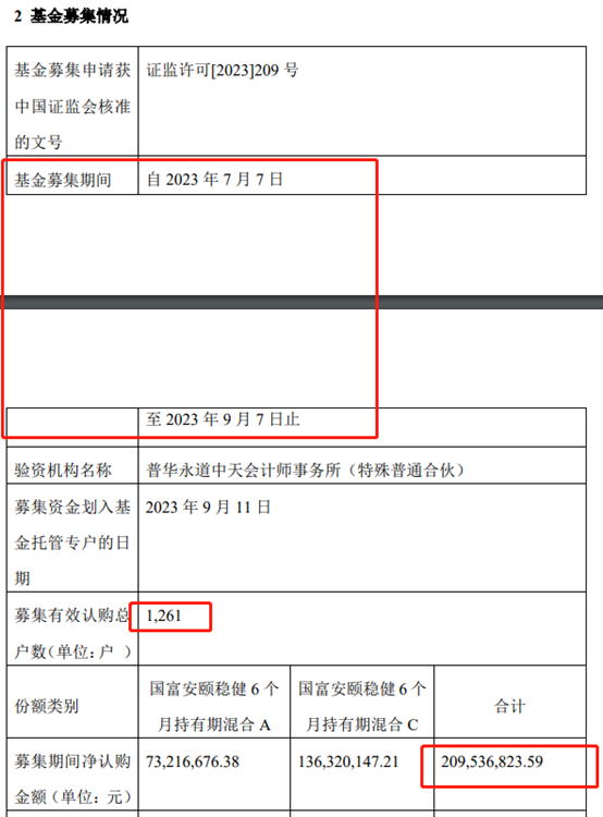 根据最新公告,国富安颐稳健6个月持有成立于2023年9月11日,A、C类份额有效认购总户数为1261户,有效认购份额合计约2.0954亿份,刚刚过线2亿份的最低份额要求。其中,基金管理人的从业人员认购约40.05万份,约占基金的0.19%。