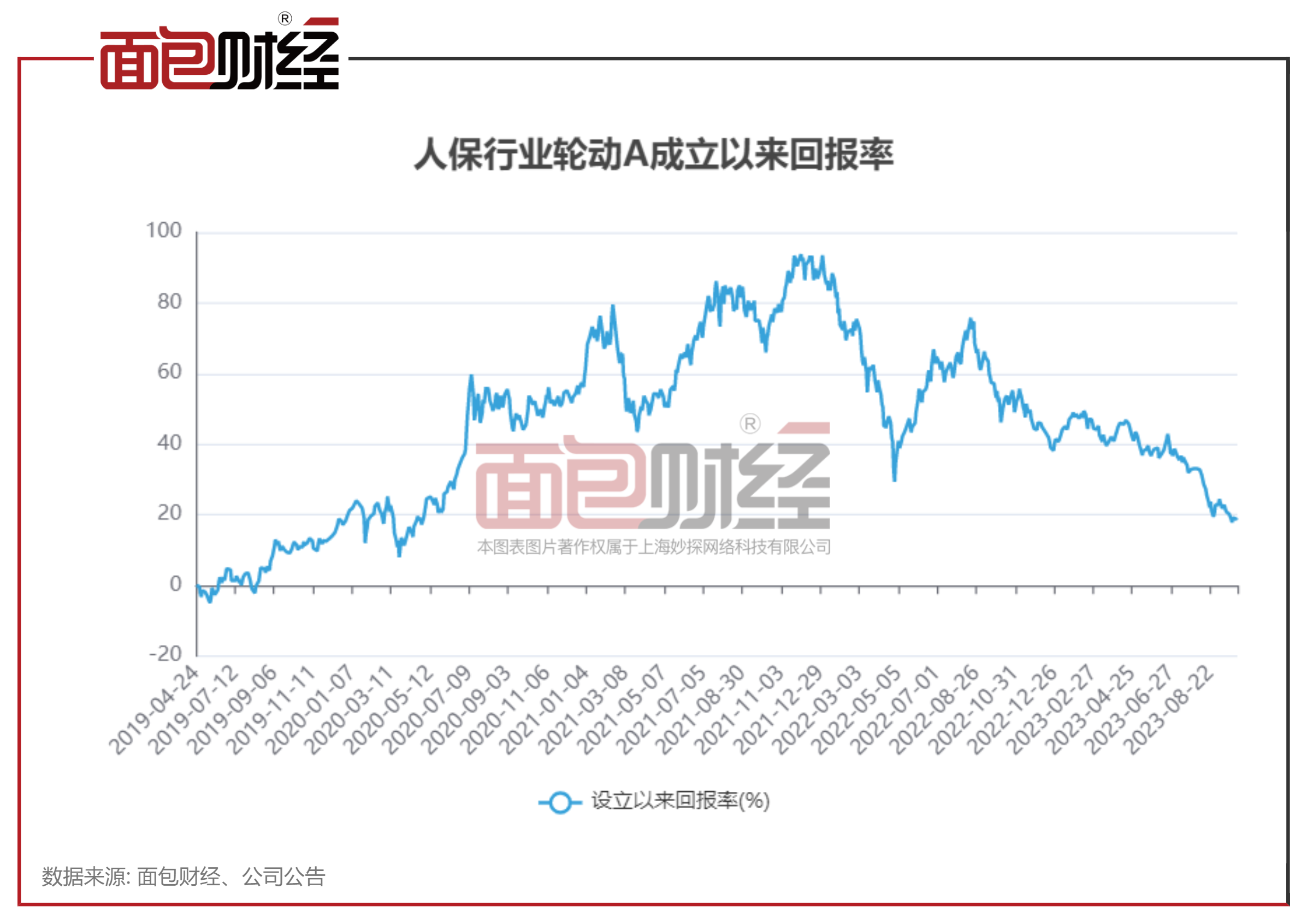 成立4年多以来,人保行业轮动A累计浮盈19.18%,跑赢业绩比较基准逾19个百分点,同类排名532/689。然而该基金的净值近一年大幅回撤21.63%,同类排名2838/3368。