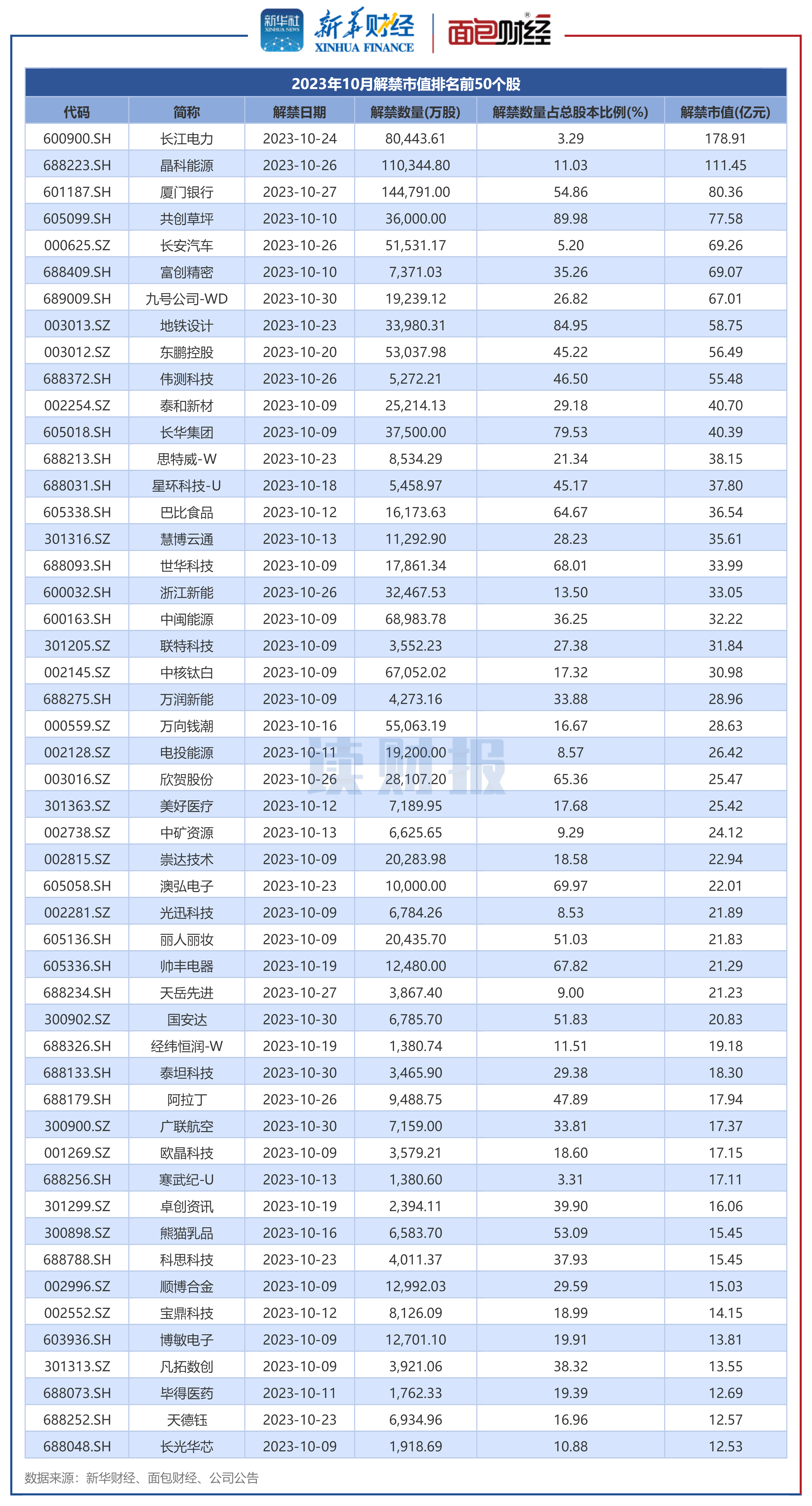 图2:2023年10月解禁市值排名前50个股