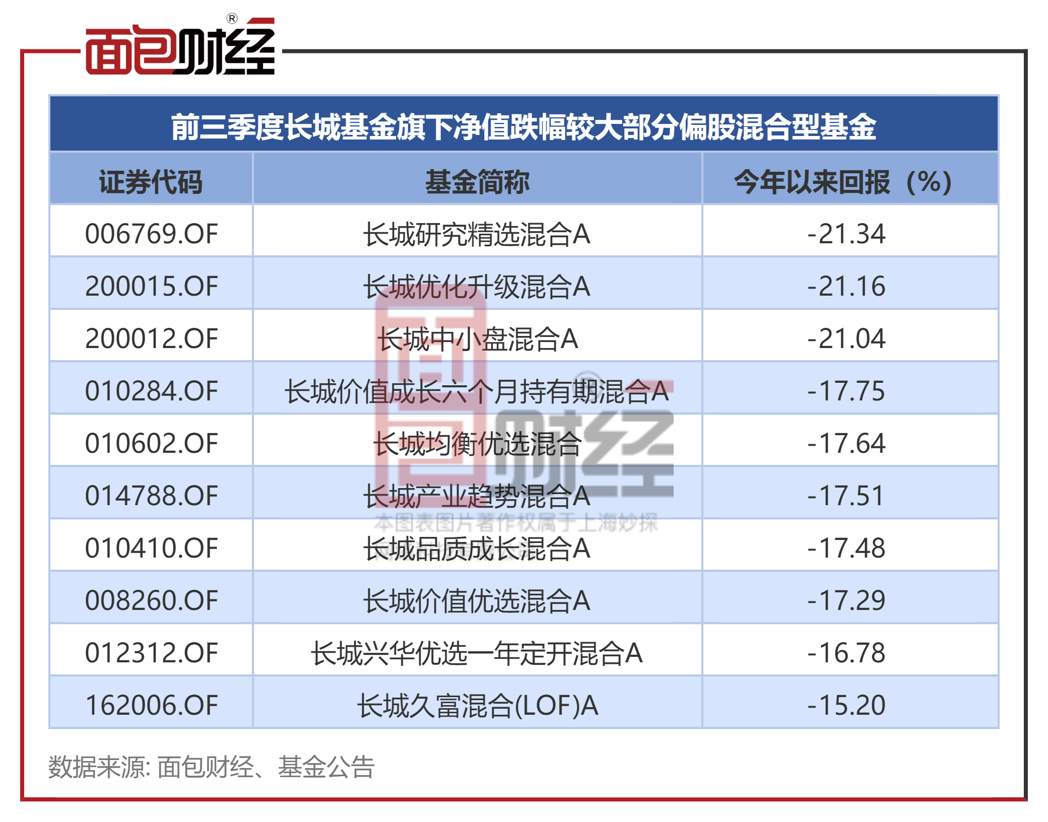 公募基金三季报披露在即,面包财经将集合三季报数据和前三个季度业绩,分类透视一些基金公司市场关注度较高的产品。本篇研究长城基金旗下偏股混合型产品前三季度业绩情况。
