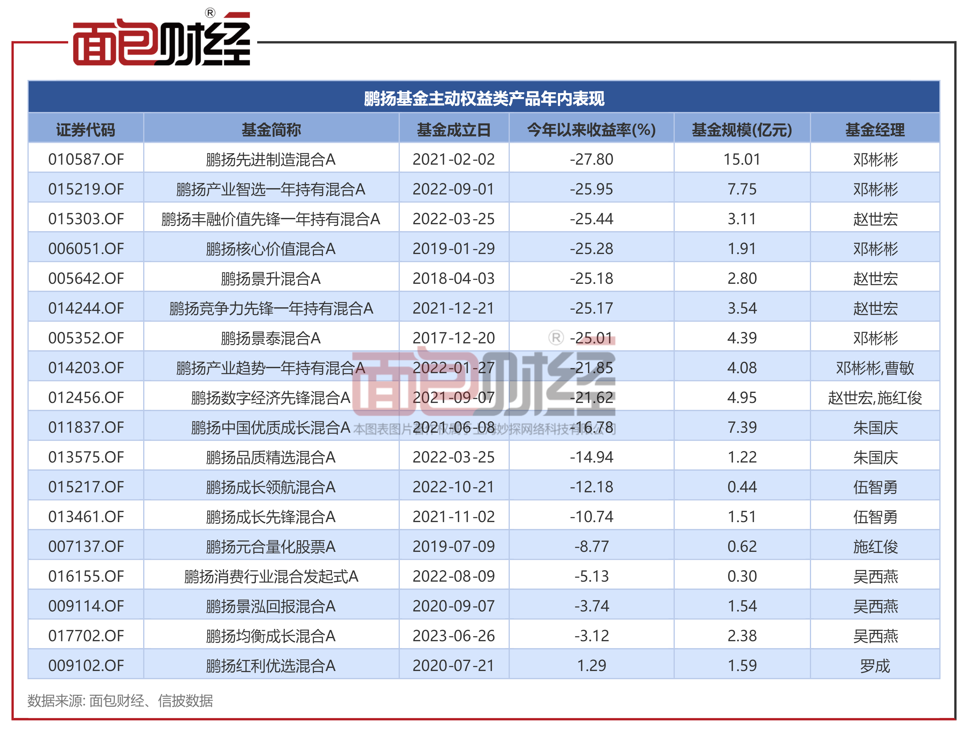 经面包财经梳理,目前鹏扬基金旗下主动权益基金共有18只(初始基金口径),合计规模约64.54亿元。