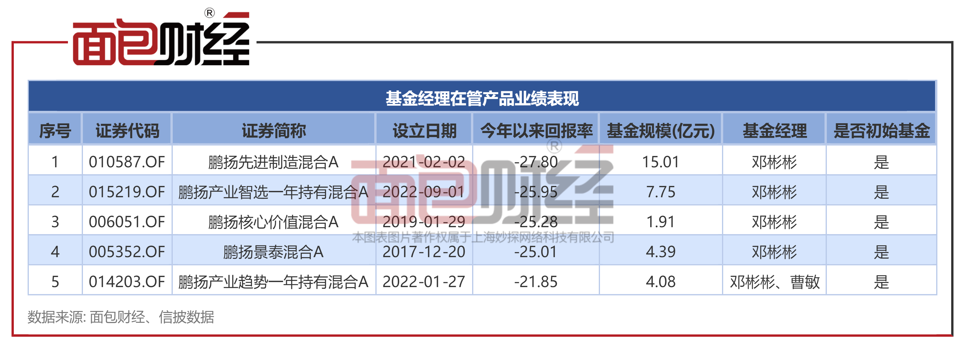 目前,邓彬彬主要管理鹏扬先进制造混合、鹏扬产业智选一年持有混合等5只产品(包括共同管理产品,初始基金口径,下同),上述产品合计规模约33亿元。