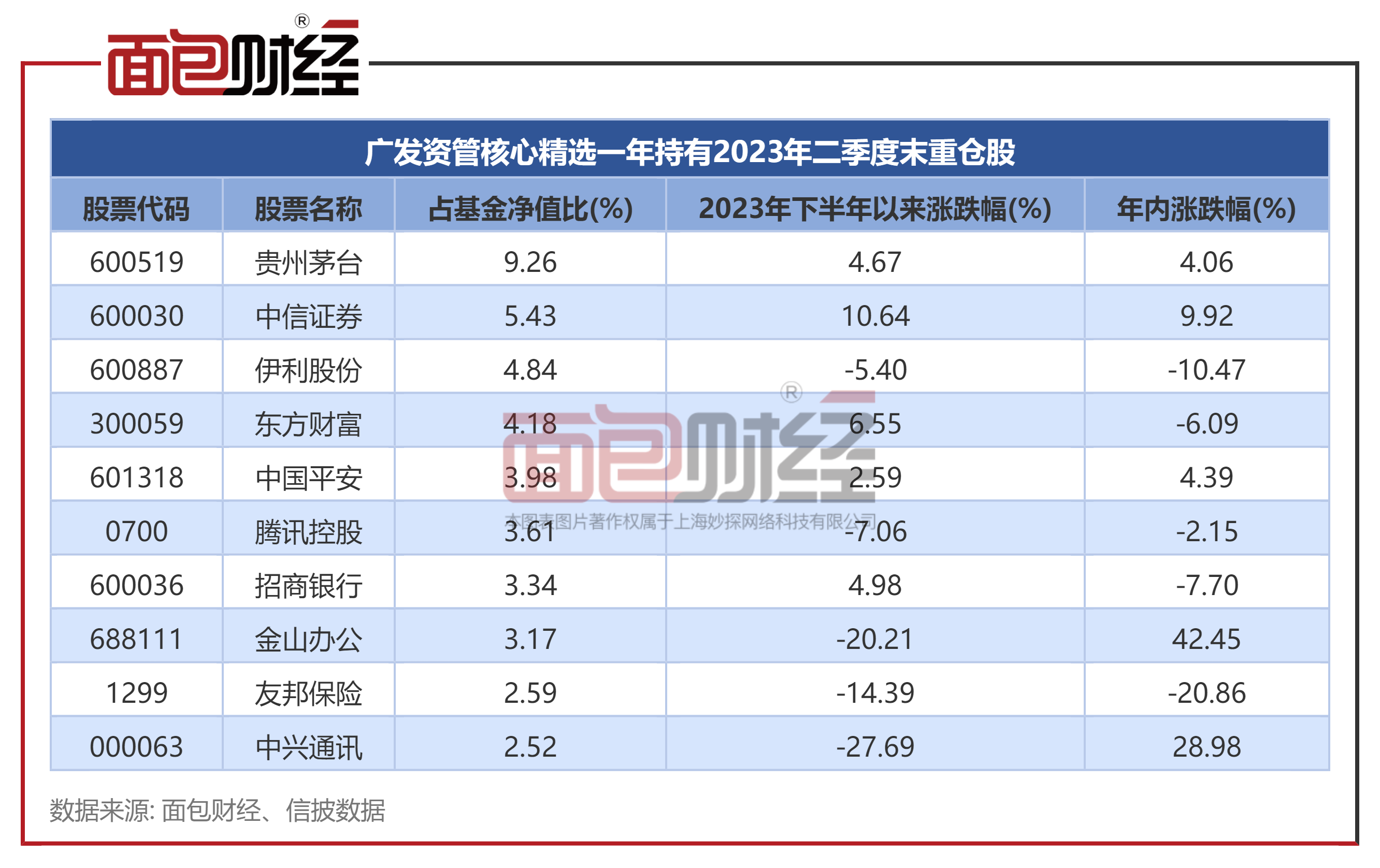 其中,该基金前十大重仓股占基金资产净值的比例为42.94%,包括贵州茅台、中信证券、伊利股份、东方财富、中国平安等。基金的配置方向主要为消费、金融、信息技术板块大市值股票。