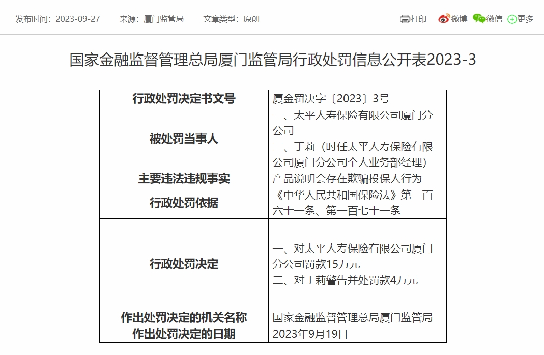 国家金融监督管理总局丽江监管分局2023年9月27日发布的公告显示,太平人寿厦门分公司因产品说明会存在欺骗投保人行为,被罚款15万元。