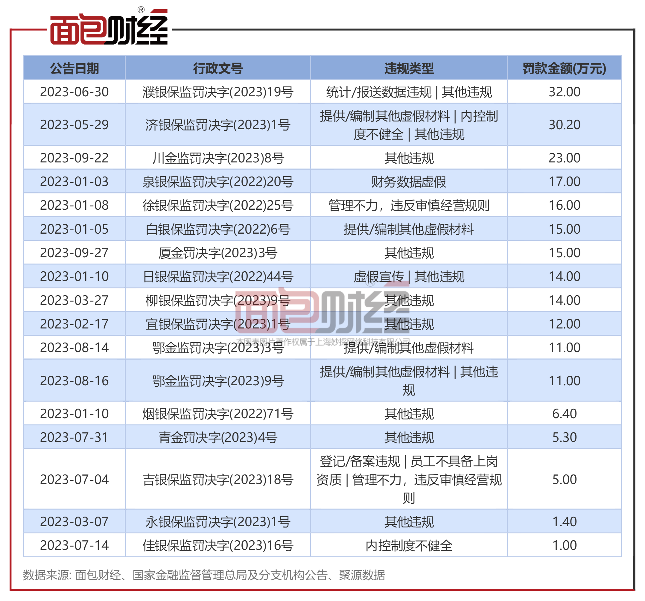面包财经对原银保监会、国家金融监督管理总局及其分支机构披露的行政处罚进行整理发现,2023年(以公告披露日计,下同)以来,太平人寿下属机构多次被监管部门处罚,被罚款总金额超200万元,其中罚款金额超30万元的罚单有2张。