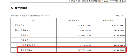 其中,2023年上半年,公司其他业务收入较去年同期减少规模较大。数据显示,越秀资本上半年其他业务收入实现30.35亿元,较去年同期下降12.74%。