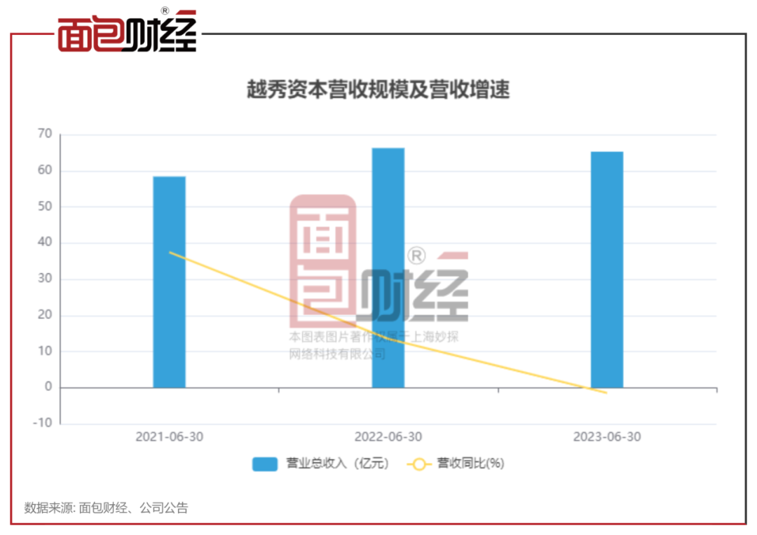 2023年中报显示,越秀资本实现营业总收入65.26亿元,同比下降1.49%;实现归母净利润14.63亿元,同比上升10.36%。