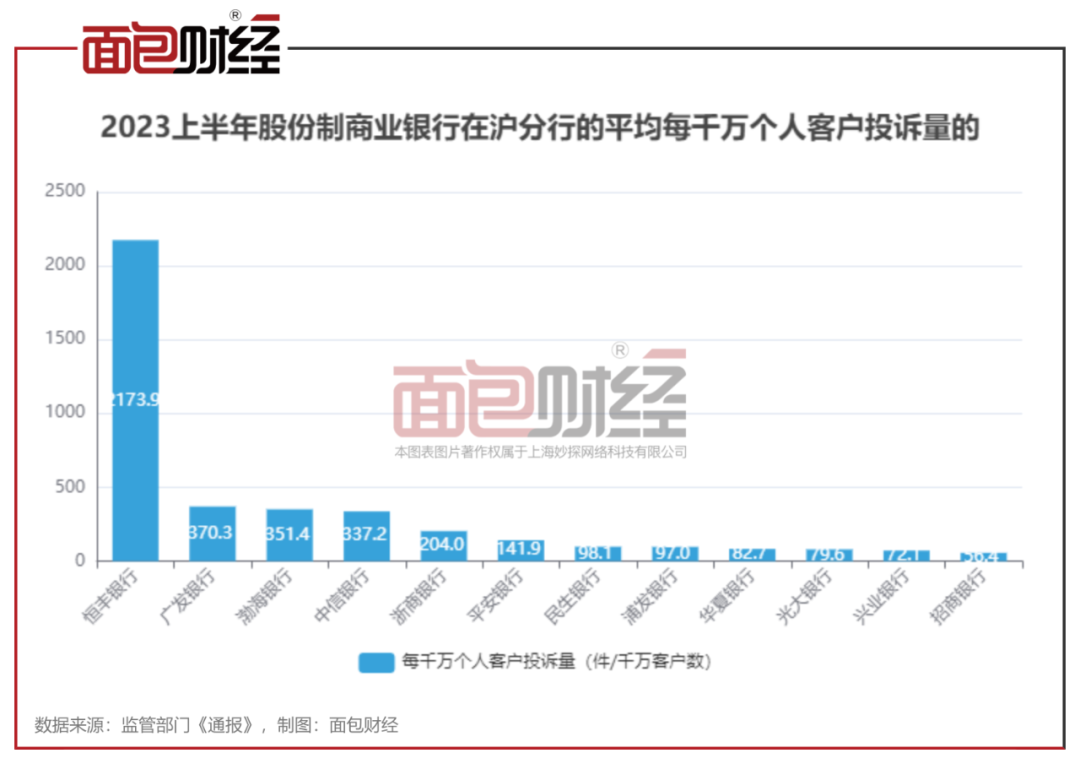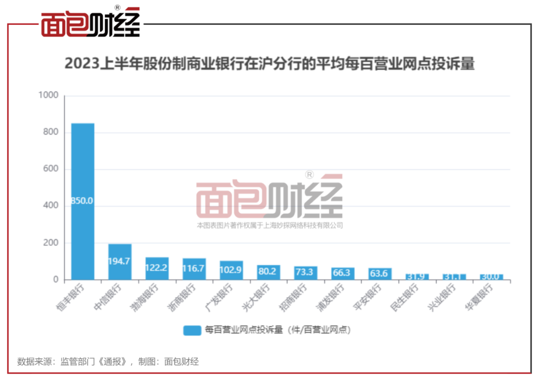 根据《通报》数据,2023上半年,渤海银行上海分行平均每百营业网点投诉量为122.2件,居股份制商业银行第三位。