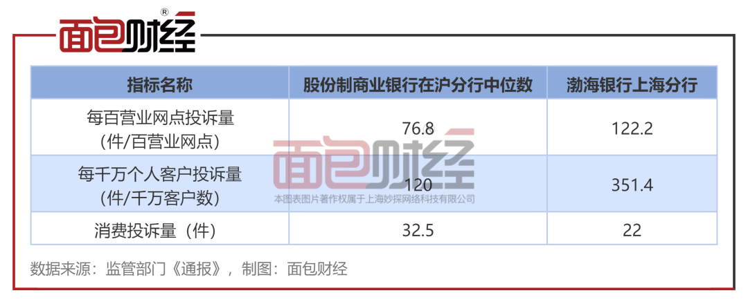 数据显示,股份制商业银行在沪分行的平均每千万个人客户投诉量的中位数为120件,渤海银行上海分行投诉量是中位数的2.93倍。