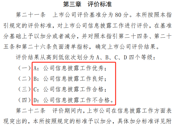 2023年8月4日,在中国证监会指导下,上交所和深交所分别修订发布了《上海证券交易所上市公司自律监管指引第9号——信息披露工作评价(2023年8月修订)》、《深圳证券交易所上市公司自律监管指引第11号——信息披露工作评价(2023年修订)》(以下简称《评价指引》)。《评价指引》显示 ,上市公司信息披露工作的评价结果分别为A(优秀)、B(良好)、C(合格)、D(不合格)。